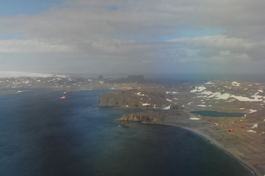 Coming in for a landing on King George Island, Antarctica. Note the Uruguayan research station (Artigas) on the right side and the Russian and Chilean settlements nestled into the valley in the middle of the picture.