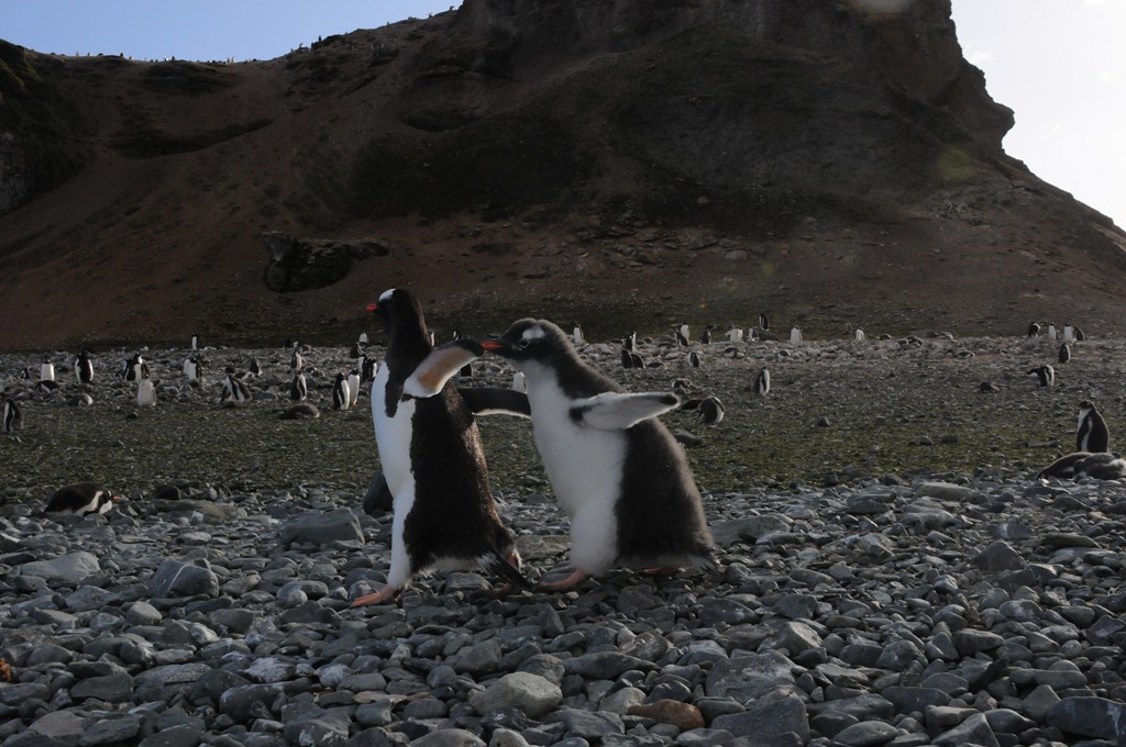 Juvenile penguins chasing their parents for food in the penguin rookery on Ardley Island, near King George Island, Antarctica