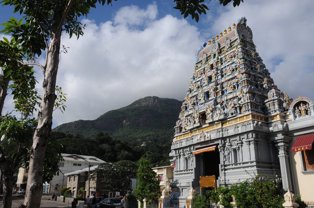 The picturesque Arulmigu Navasakti Vinayagar Temple in Victoria provides for a striking contrast to the tropical granite cliffs behind the city itself, and provides a place of worship for the Hindu contingent in the country.