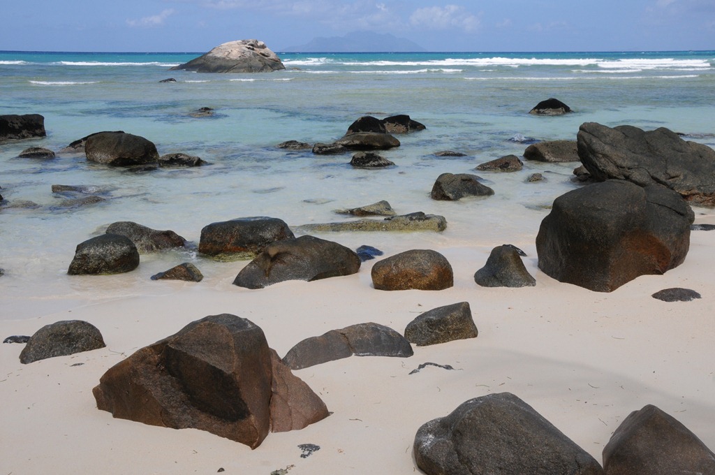 The far end of the beach is littered with dark granite boulders, both big and small, providing for a fascinating contrast with the bleached white sand of the beach itself.