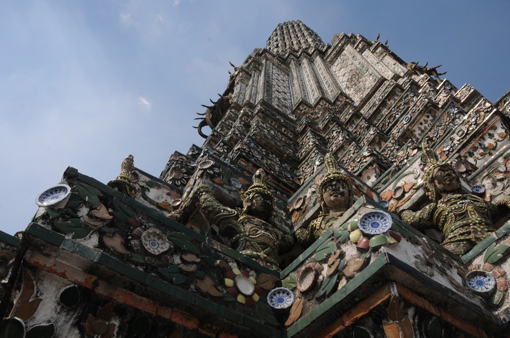 On the other side of the Chao Phraya River from the Golden Palace and Wat Pho lies an even more impressive temple known as Wat Arun, or the Temple of Dawn. One of the main features of this impressive temple is the enormous tower that is encrusted with colorful porcelain and intricate figures.