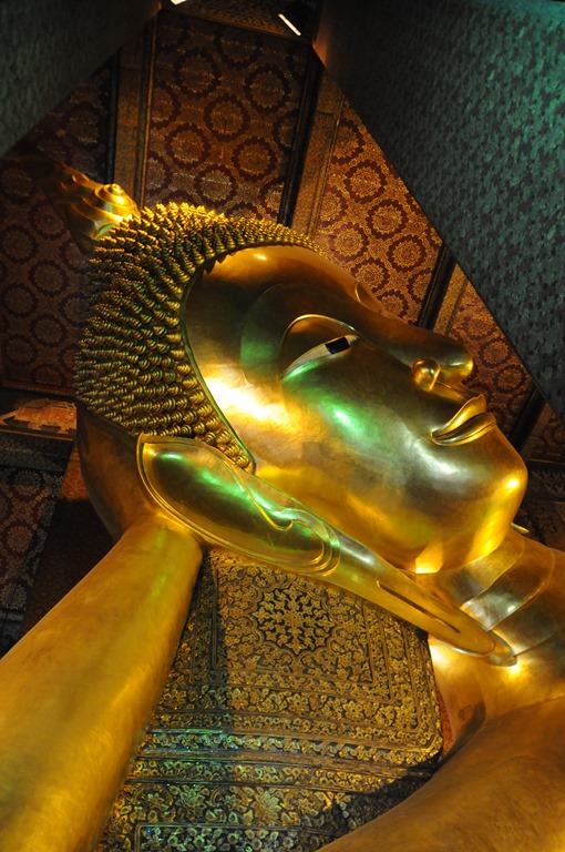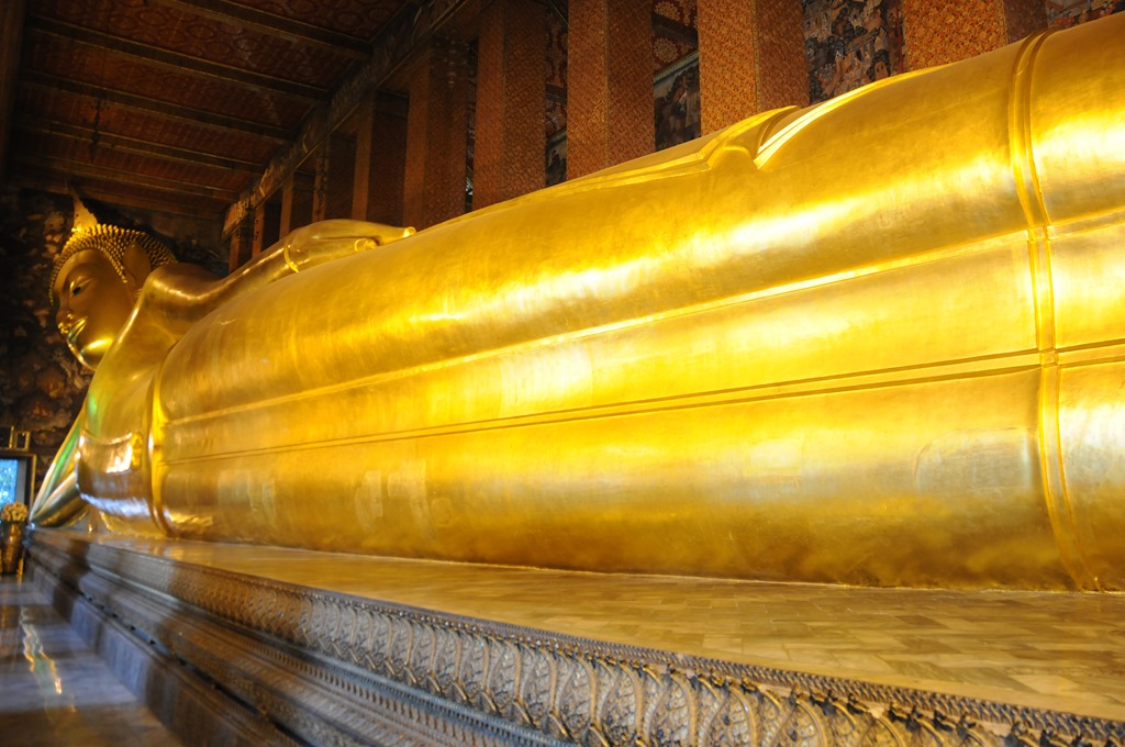 On the banks of the Chao Phraya River and immediately adjacent to the Thai Grand Palace is a temple complex known as Wat Pho. Now, by itself, Wat Pho is a gorgeous series of grand and beautiful temples that also happens to be one of the oldest wats in Bangkok. But what really makes this place special is the gold-leaf painted 15 meter tall and 43 meter long reclining statue of Buddha housed in one of the temples here.
